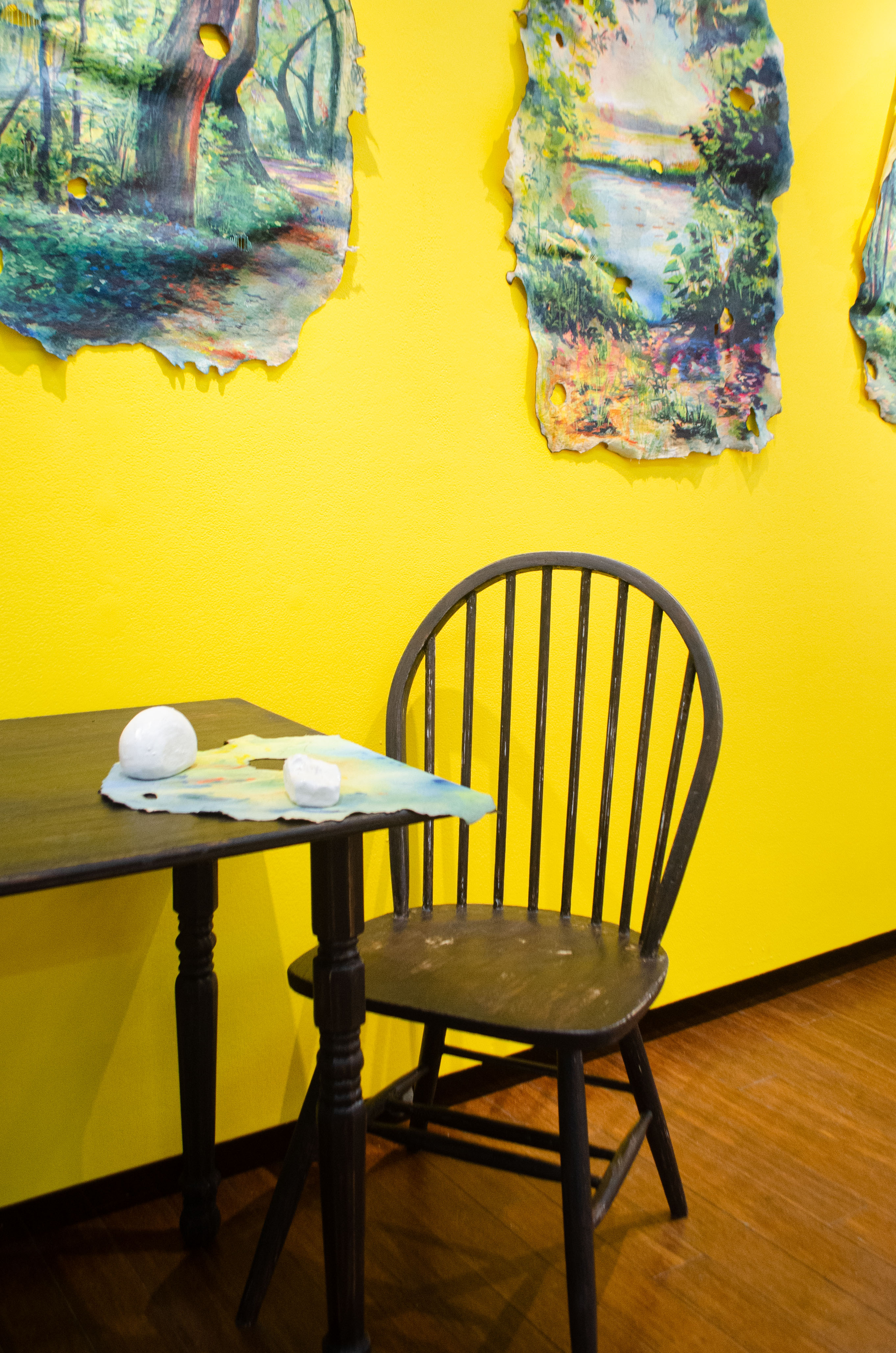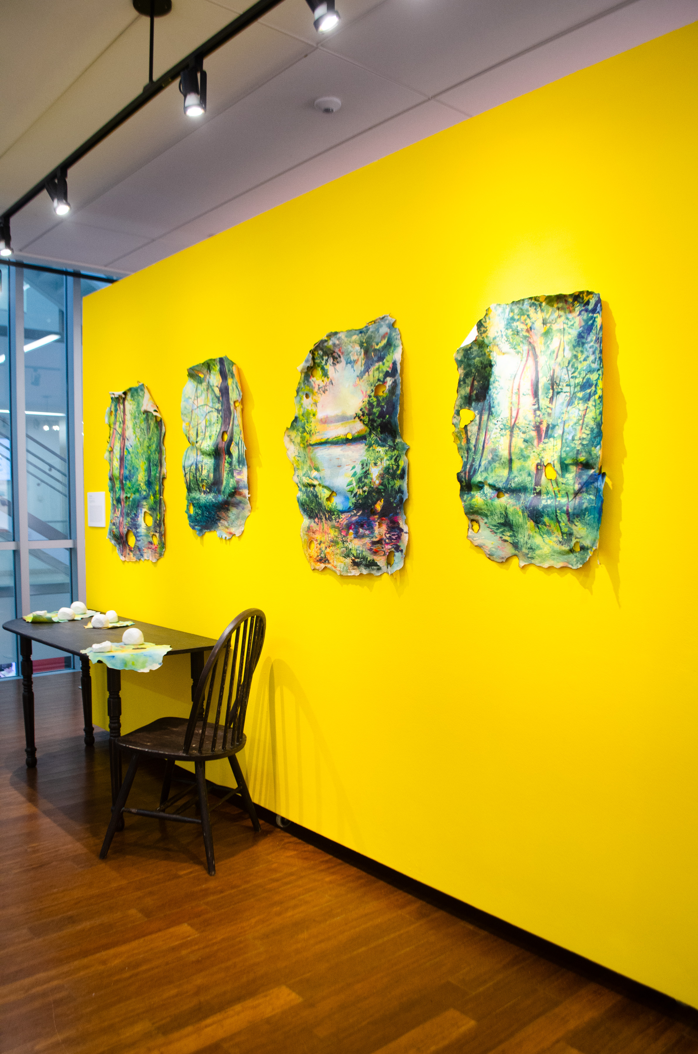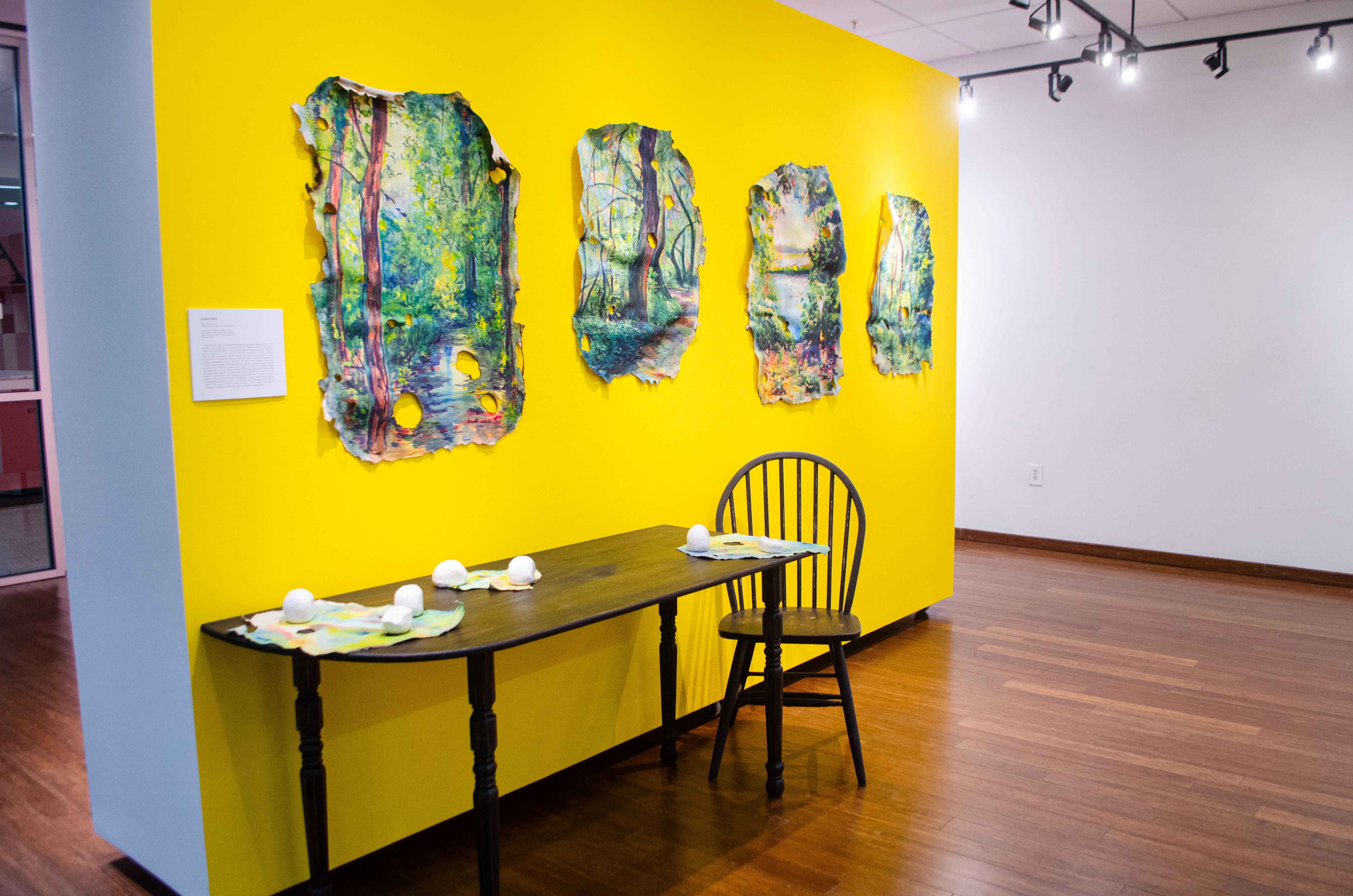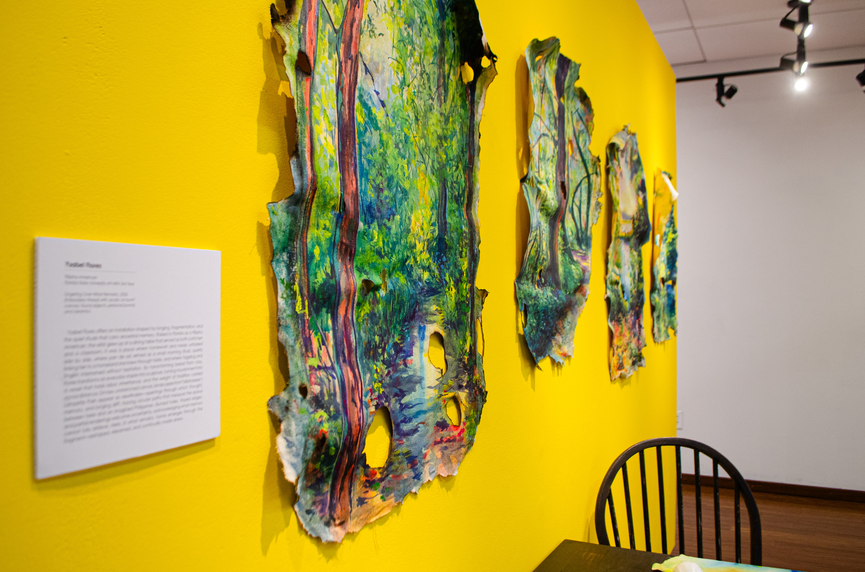 “Ysabel Flores offers an installation shaped by longing, fragmentation, and the quiet rituals that carry ancestral memory. Raised in Rorida as a Filipino American, the artist grew up at a dining table that served as both a kitchen and a classroom, it was a place where homework and meals unfolded side by side, where pan de sal arrived as a small morning ritual, quietly linking her to a homeland she knew through taste, and where Tagalog and English intertwined without hesitation. By hand-forming bread from clay. Flores transforms an everyday staple into sculpture, turning nourishment into a vessel that holds labor, inheritance, and the weight of tradition carried aprass distance Oriraw, unstretched canvas, landscapes from Tallahassee’s Lafayette Park appear as viewfinders-openings through which thought, memory, and longing drift, tracing circular paths that measure the space between here and an imagined Phillippines. Burned holes, frayed edges. and partial renderings welcome uncertainty, acknowledging what memory sannot fully retrieve. Here, in what remains, home emerges through the fragment-reshaped, relearned, and continually made anew” – Sara I. Rodríguez Rivera