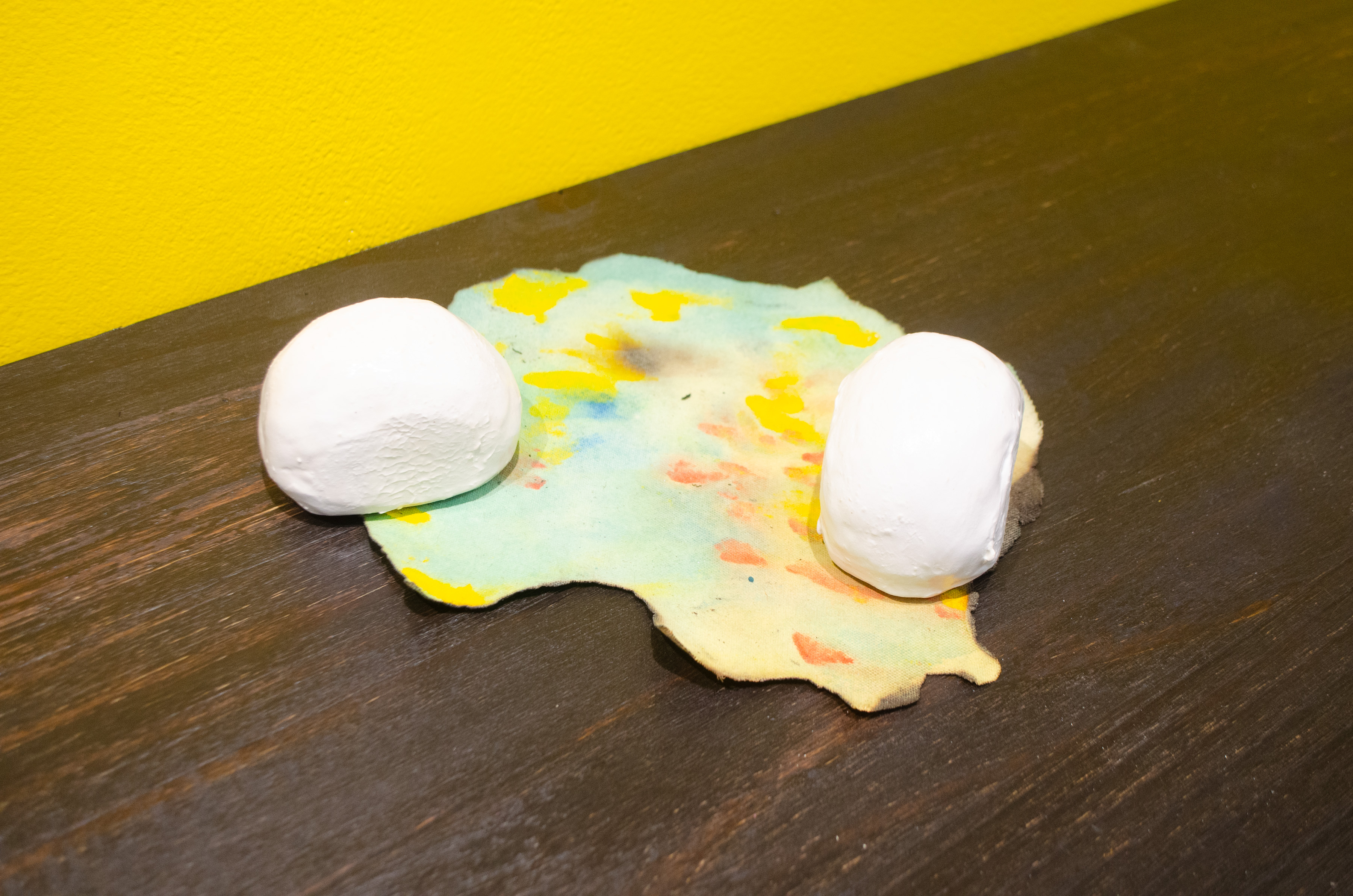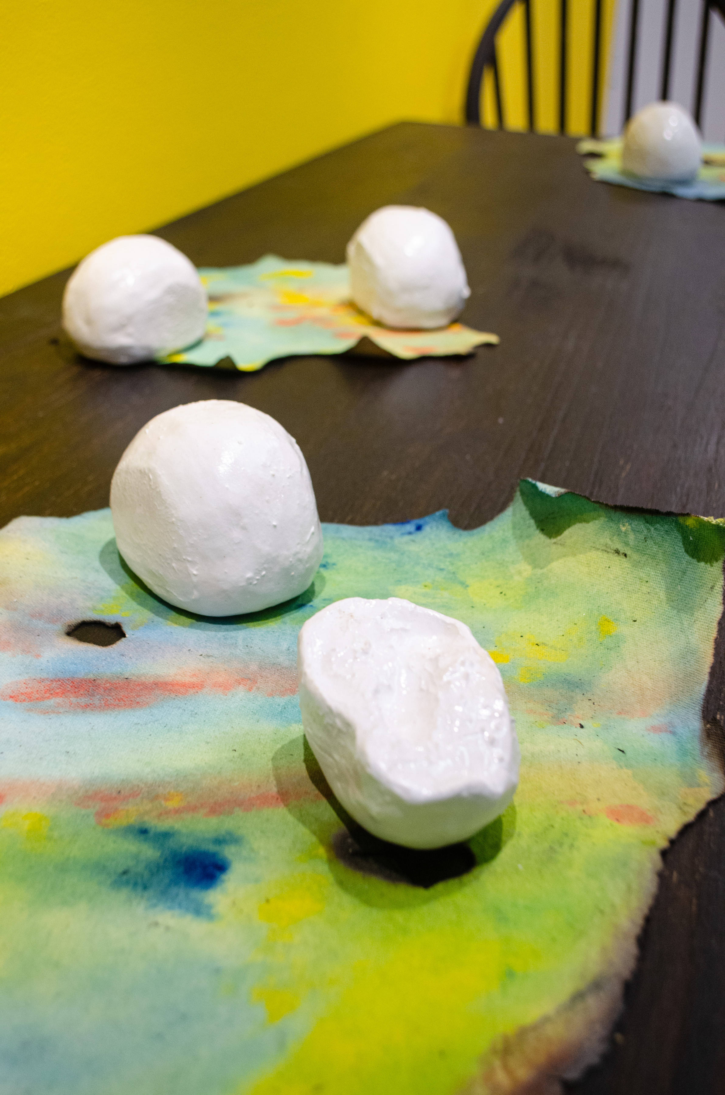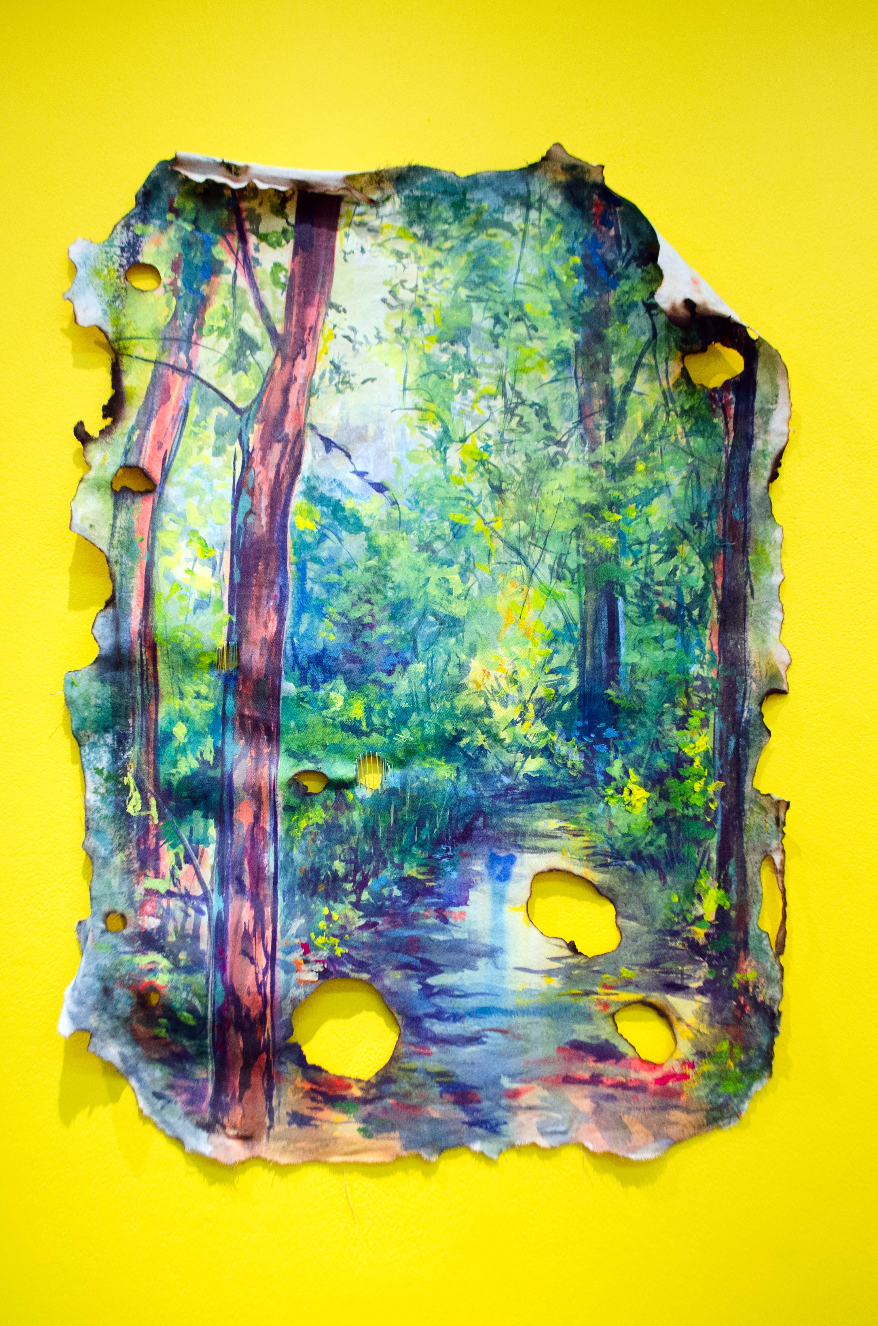 “Ysabel Flores offers an installation shaped by longing, fragmentation, and the quiet rituals that carry ancestral memory. Raised in Rorida as a Filipino American, the artist grew up at a dining table that served as both a kitchen and a classroom, it was a place where homework and meals unfolded side by side, where pan de sal arrived as a small morning ritual, quietly linking her to a homeland she knew through taste, and where Tagalog and English intertwined without hesitation. By hand-forming bread from clay. Flores transforms an everyday staple into sculpture, turning nourishment into a vessel that holds labor, inheritance, and the weight of tradition carried aprass distance Oriraw, unstretched canvas, landscapes from Tallahassee’s Lafayette Park appear as viewfinders-openings through which thought, memory, and longing drift, tracing circular paths that measure the space between here and an imagined Phillippines. Burned holes, frayed edges. and partial renderings welcome uncertainty, acknowledging what memory sannot fully retrieve. Here, in what remains, home emerges through the fragment-reshaped, relearned, and continually made anew” – Sara I. Rodríguez Rivera