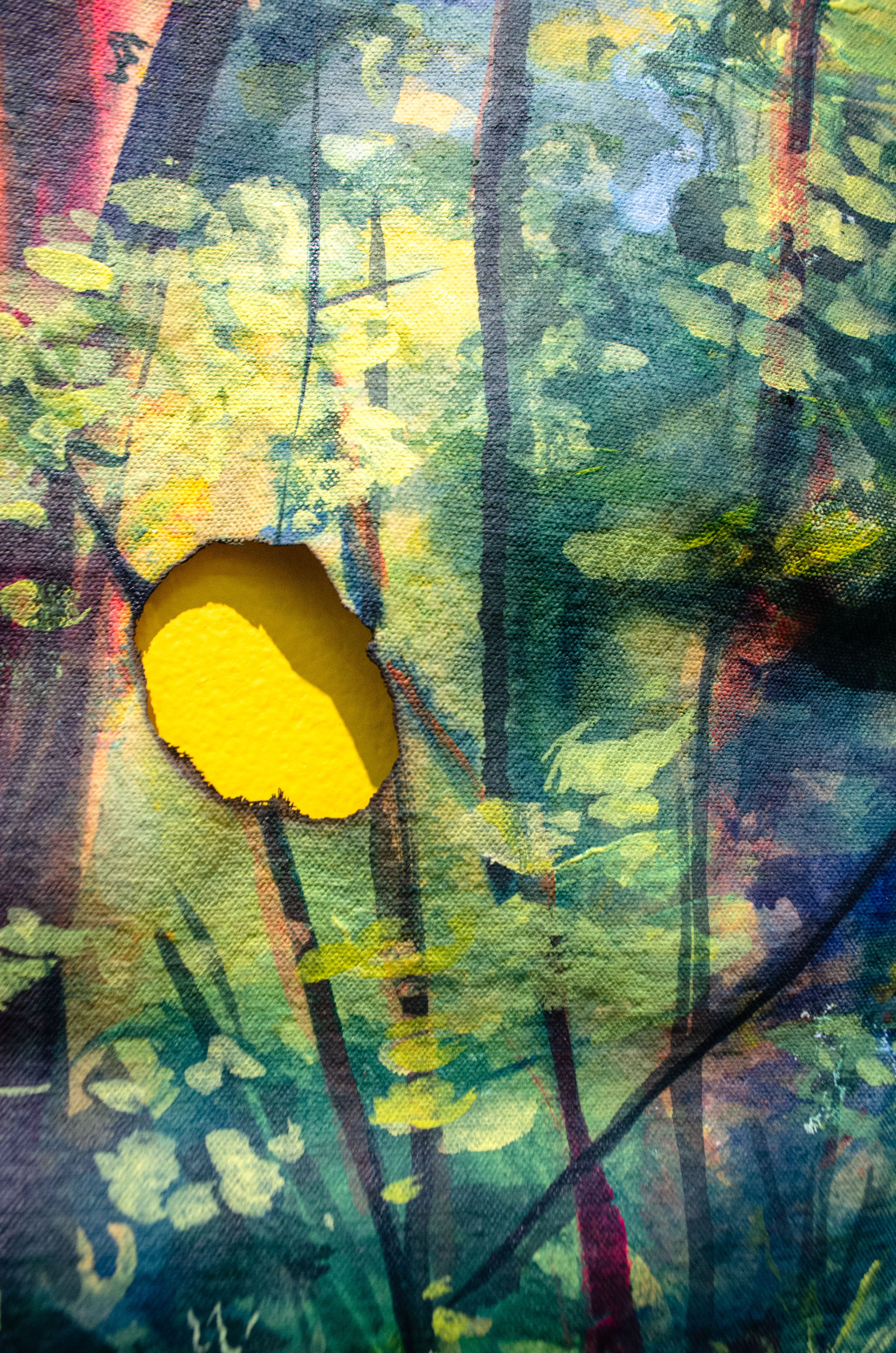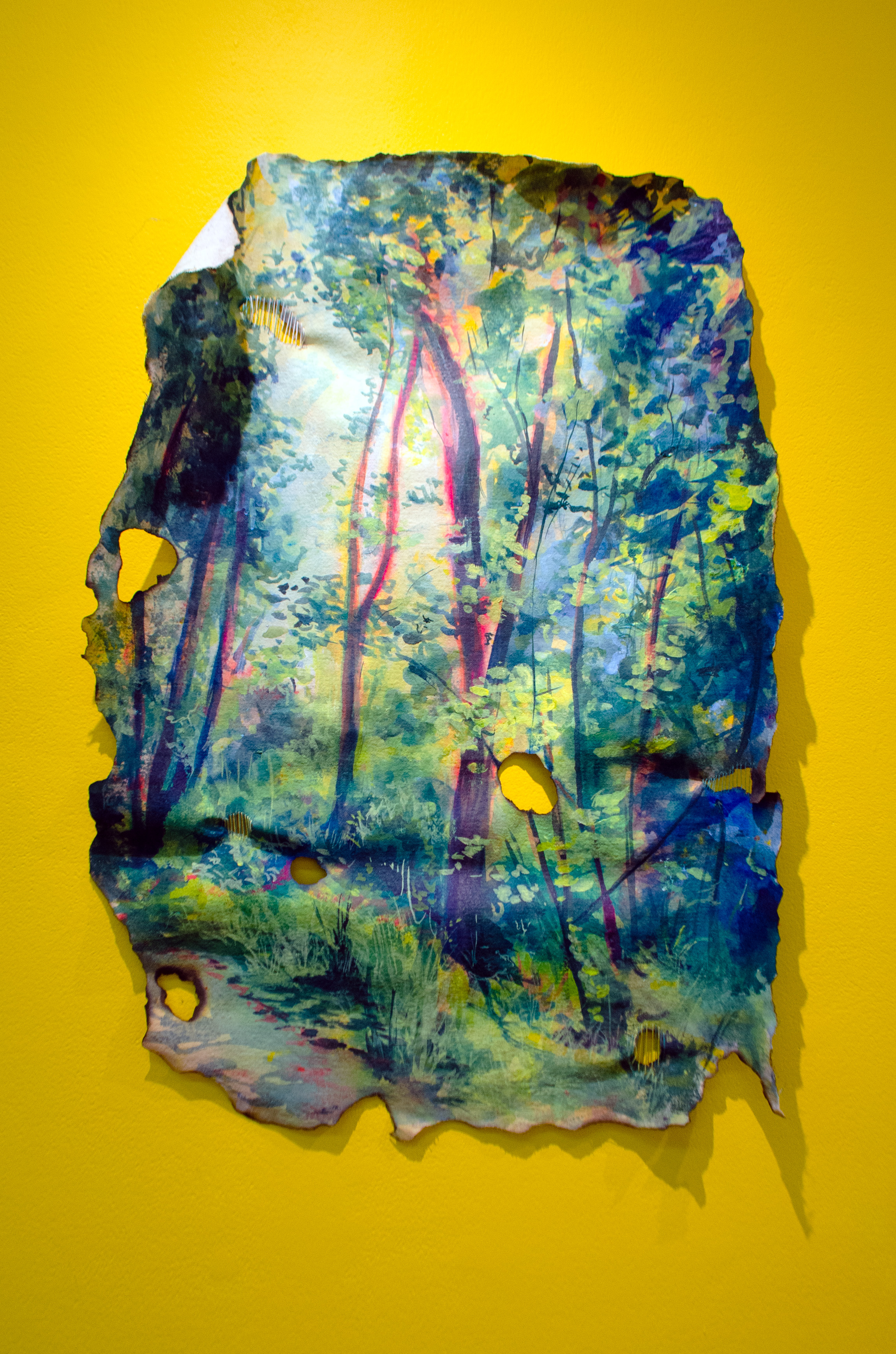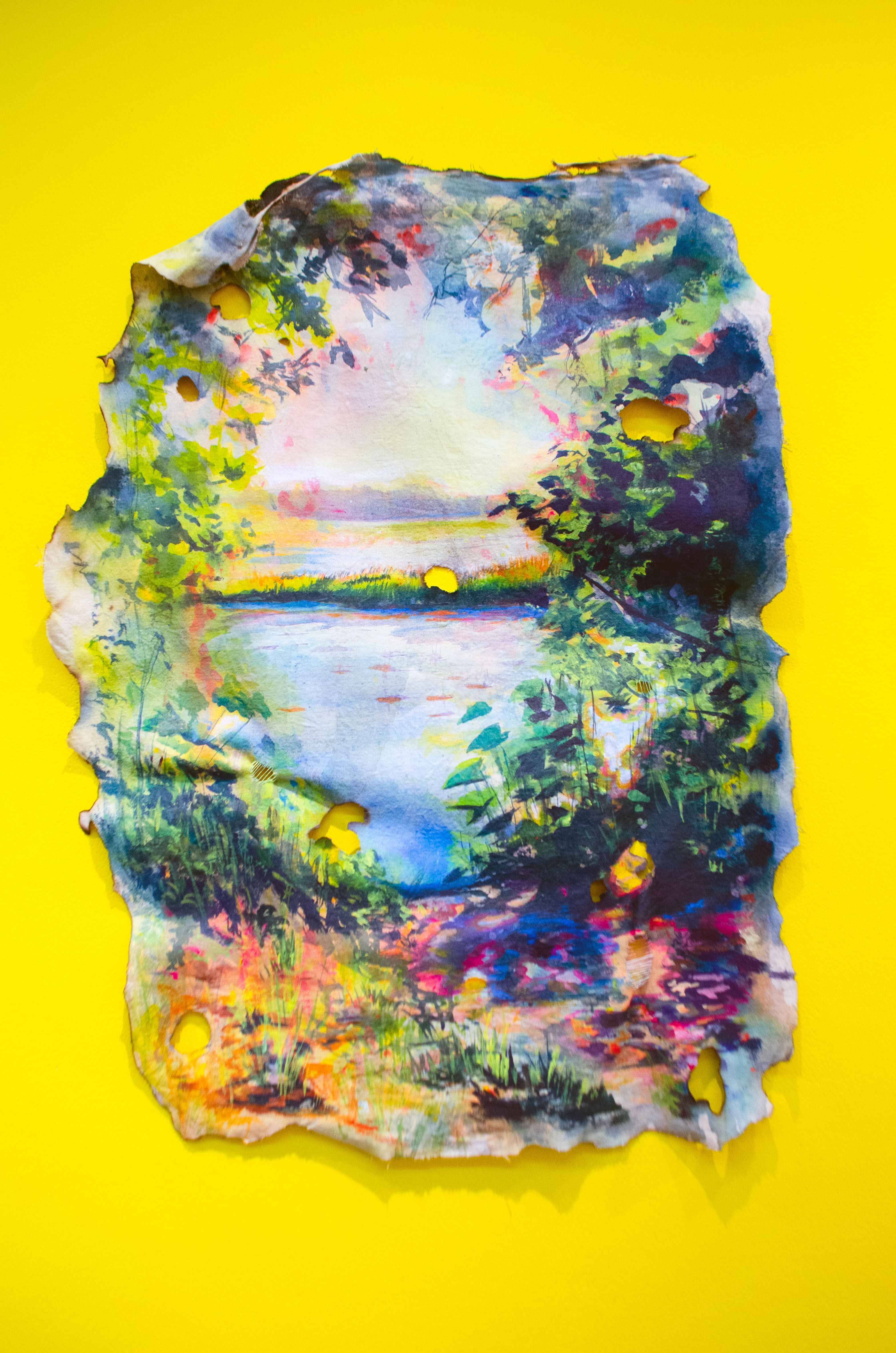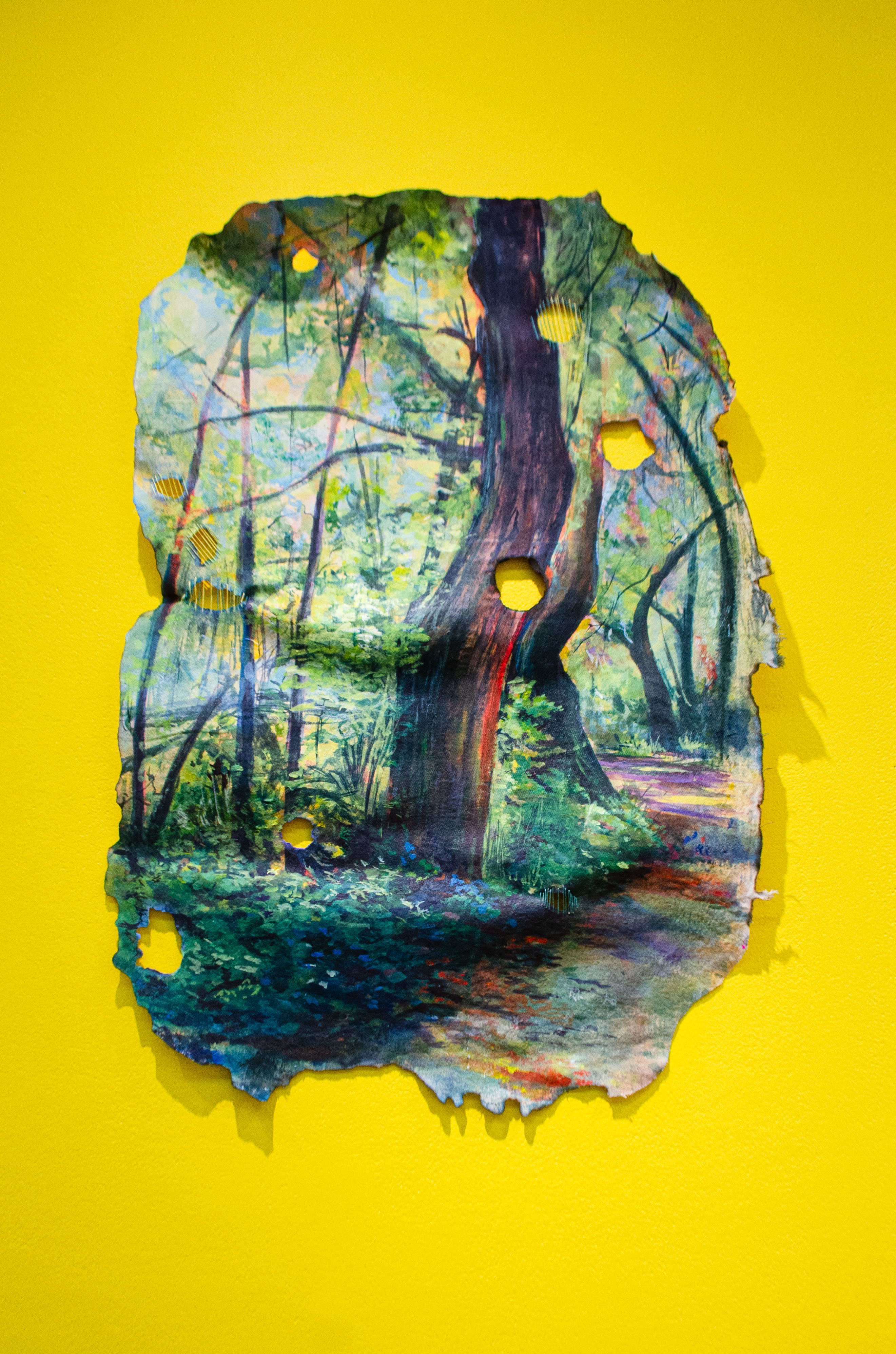 “Ysabel Flores offers an installation shaped by longing, fragmentation, and the quiet rituals that carry ancestral memory. Raised in Rorida as a Filipino American, the artist grew up at a dining table that served as both a kitchen and a classroom, it was a place where homework and meals unfolded side by side, where pan de sal arrived as a small morning ritual, quietly linking her to a homeland she knew through taste, and where Tagalog and English intertwined without hesitation. By hand-forming bread from clay. Flores transforms an everyday staple into sculpture, turning nourishment into a vessel that holds labor, inheritance, and the weight of tradition carried aprass distance Oriraw, unstretched canvas, landscapes from Tallahassee’s Lafayette Park appear as viewfinders-openings through which thought, memory, and longing drift, tracing circular paths that measure the space between here and an imagined Phillippines. Burned holes, frayed edges. and partial renderings welcome uncertainty, acknowledging what memory sannot fully retrieve. Here, in what remains, home emerges through the fragment-reshaped, relearned, and continually made anew” – Sara I. Rodríguez Rivera