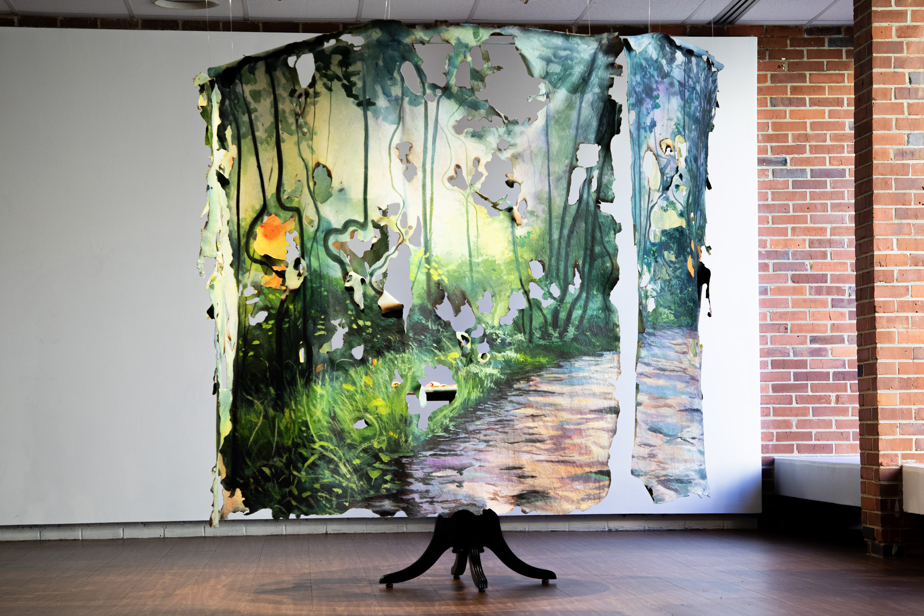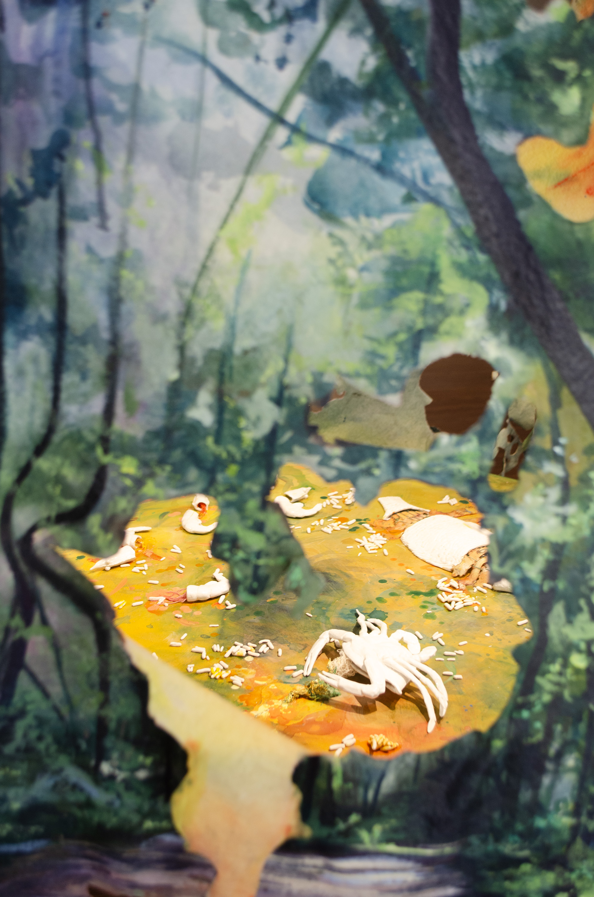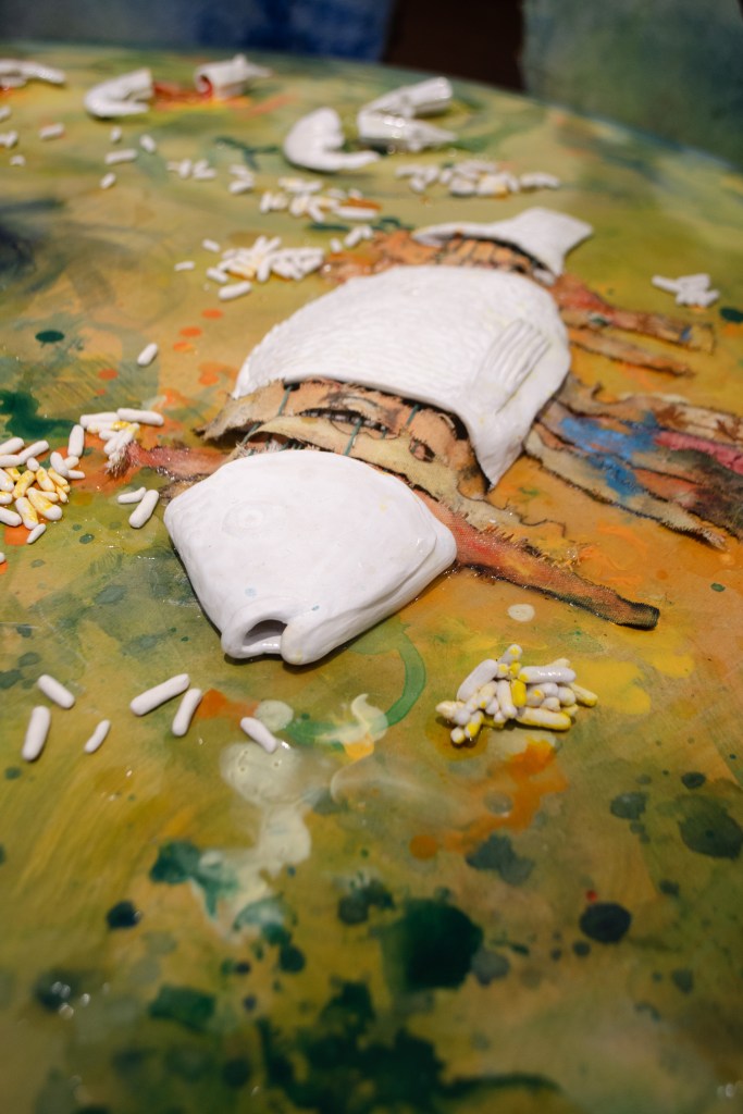 Raised in FL as a Filipino American, I have maintained a long-distance relationship to the Philippines through familial memories, recipes, and verbal descriptions of it. In Looking In/Looking Out, experimental paintings and hand-built ceramics emerge from a simulated intimate space to initiate cultural dialogue. Cutting up, tearing, and burning the canvas challenge painting traditions and illustrate the fluidity and puzzle-like nature of shaping identity. Weaving together an image of entangled cultures and reflecting on my upbringing in Florida, the natural landscapes of home provide a colorful context in contrast to what an imagined Philippines could potentially look like. Considering the humid climate, the subtropical terrain, and the diverse plant life of Florida, I wonder how my present surroundings compare to the tropical islands that surrounded my ancestors. Taking clay and carving childhood foods from Pandesal to Pinaputok na Tilapia, my hands form connections to the sacred memories of eating at the table, holding space for messy meals and even messier conversations about life. Among my works, I explore how the gifts and the burdens of cultural heritage are demarcated to the ordinary moments in life. It is in the quiet daily rituals of cooking, eating, and walking that I find the echoes of the past the most comforting and the most haunting.
