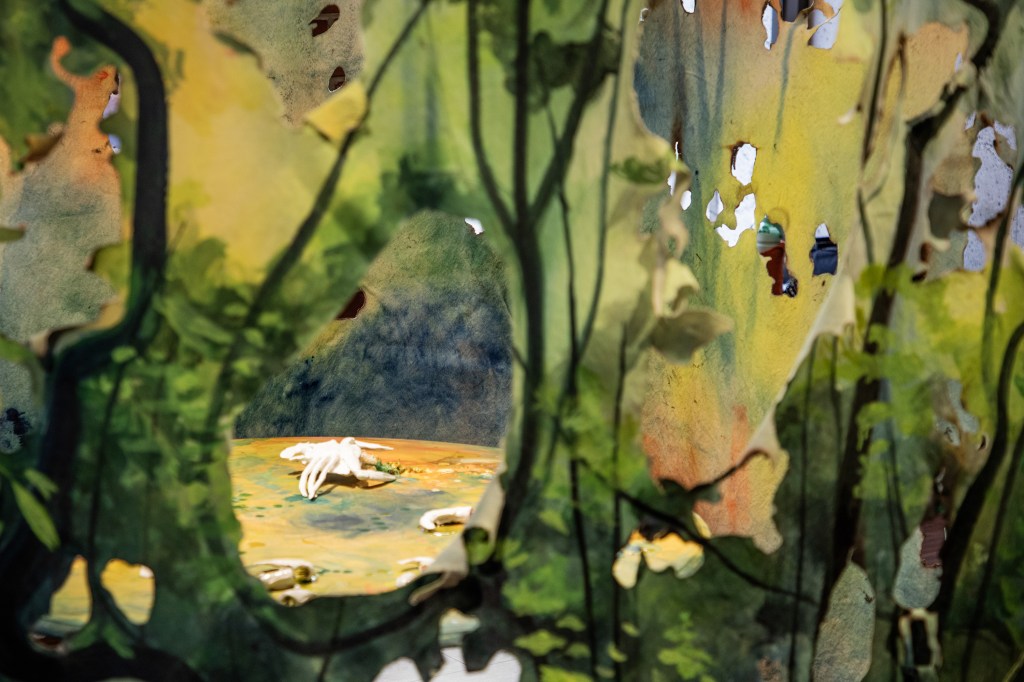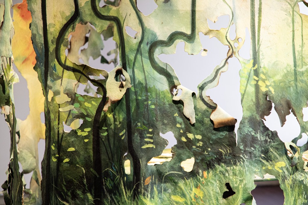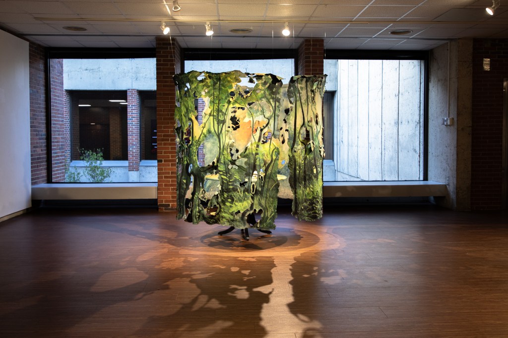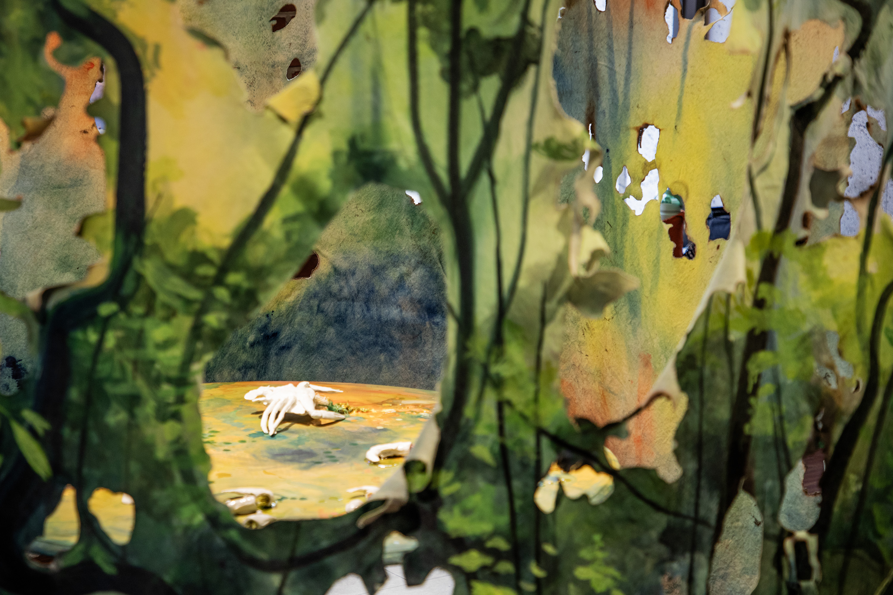 Raised in FL as a Filipino American, I have maintained a long-distance relationship to the Philippines through familial memories, recipes, and verbal descriptions of it. In Looking In/Looking Out, experimental paintings and hand-built ceramics emerge from a simulated intimate space to initiate cultural dialogue. Cutting up, tearing, and burning the canvas challenge painting traditions and illustrate the fluidity and puzzle-like nature of shaping identity. Weaving together an image of entangled cultures and reflecting on my upbringing in Florida, the natural landscapes of home provide a colorful context in contrast to what an imagined Philippines could potentially look like. Considering the humid climate, the subtropical terrain, and the diverse plant life of Florida, I wonder how my present surroundings compare to the tropical islands that surrounded my ancestors. Taking clay and carving childhood foods from Pandesal to Pinaputok na Tilapia, my hands form connections to the sacred memories of eating at the table, holding space for messy meals and even messier conversations about life. Among my works, I explore how the gifts and the burdens of cultural heritage are demarcated to the ordinary moments in life. It is in the quiet daily rituals of cooking, eating, and walking that I find the echoes of the past the most comforting and the most haunting.